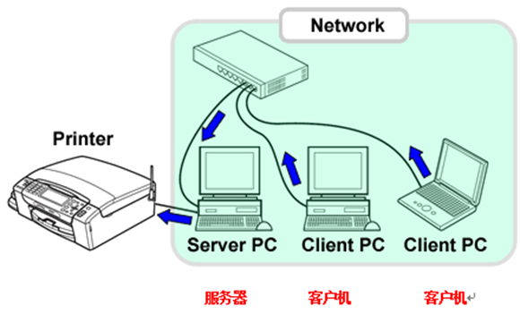 共享打印功能,是基于Windows操作系统中的“打印机和文件共享”功能模块实现的,在网络共享环境下,每个客户端电脑通过服务器电脑发送打印数据到打印机。