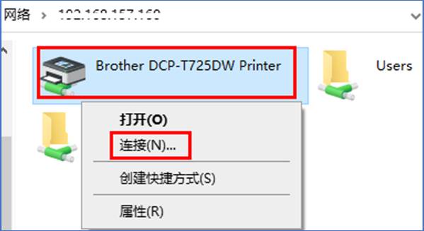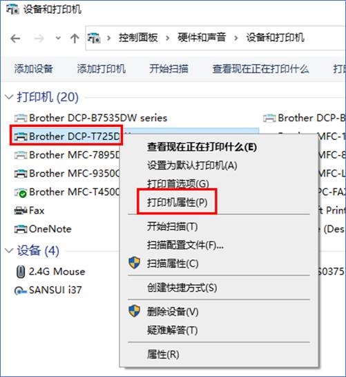 5,在设备与打印机中,找到所需共享的打印机,右键点击打印机图标,单击打印机属性(本例以DCP-T725DW机型为例)